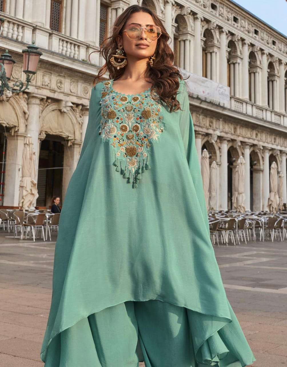 FABRIC - PREMIUM FRENCH CREP SILK / REAL CHINON SILK ( STYLIST LOOK LONG CUT STYLE HAND EMBROIDERED TOP WITH PLAZZO )