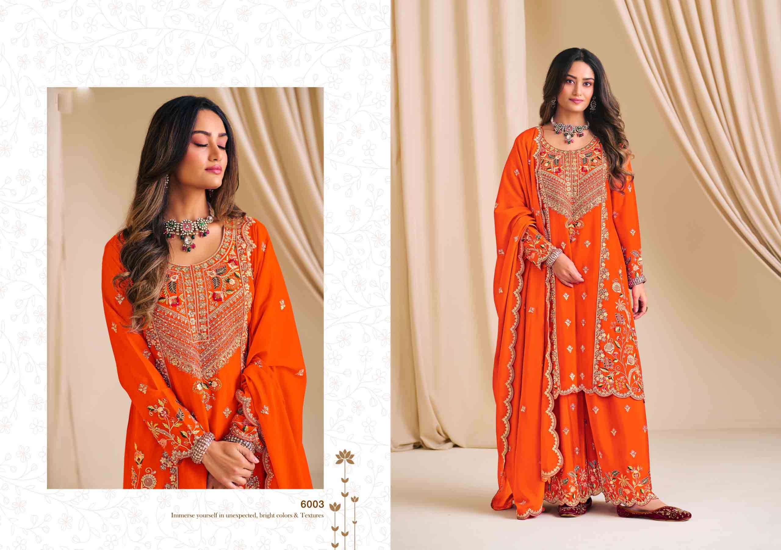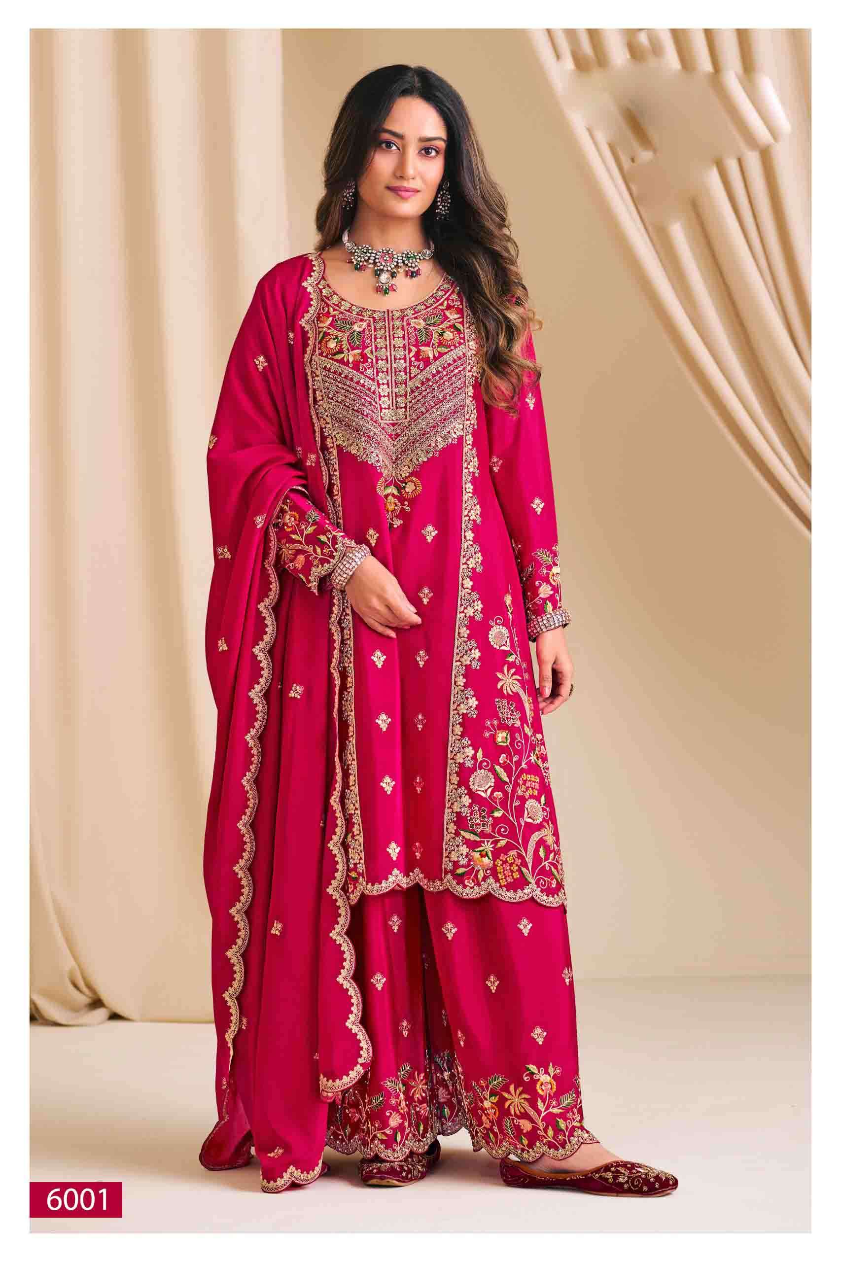 | BOTTOM : | heavy premium chinon with full flur plazo work (free size stitched) |
