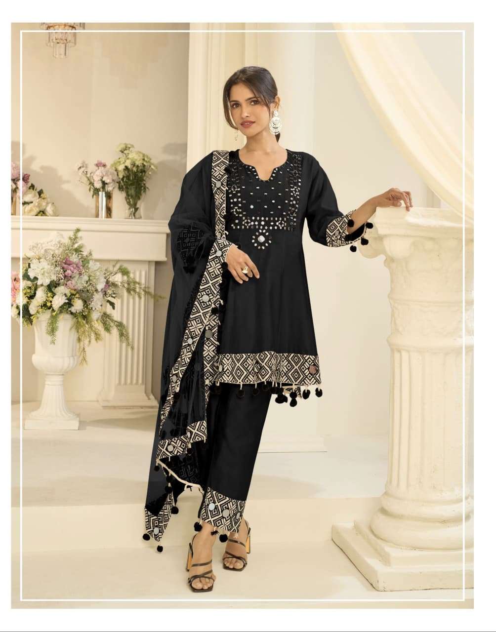 Product Name - sanvi black & white heavy chinon beads work Short Top with Palazzo and Dupatta set