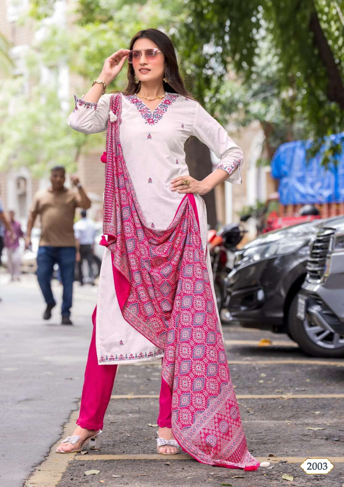 Product Name - safarnama vol 8 kailee by krisha creation cotton schiffli handwork fancy kurti pant with dupatta set