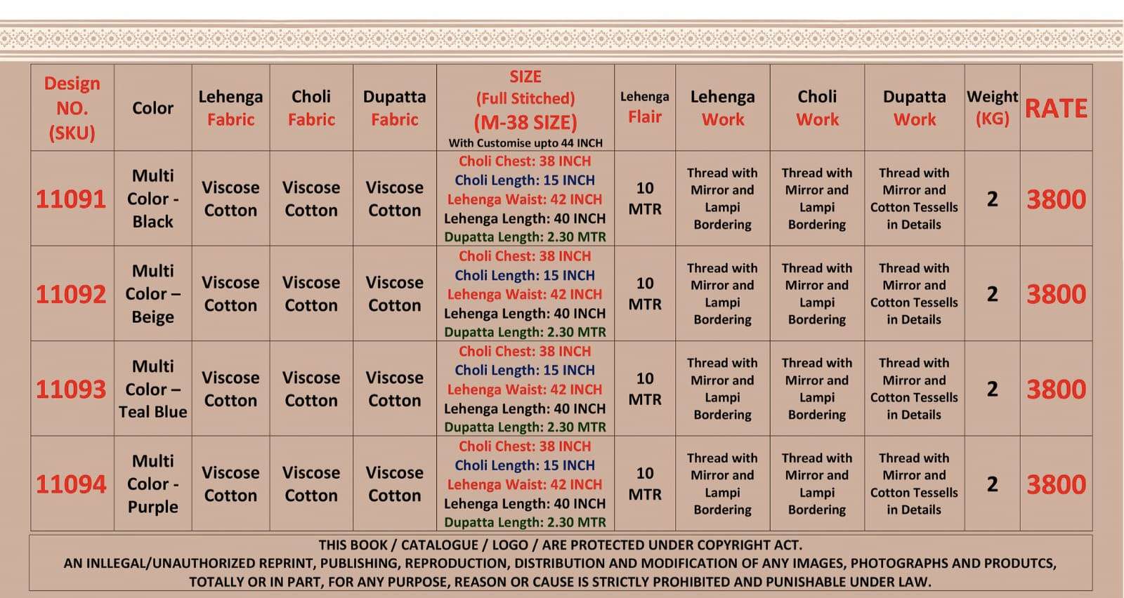 Lehenga Length (Stitched): 40 INCH Length • 42 Waist. & Length: 15 INCH