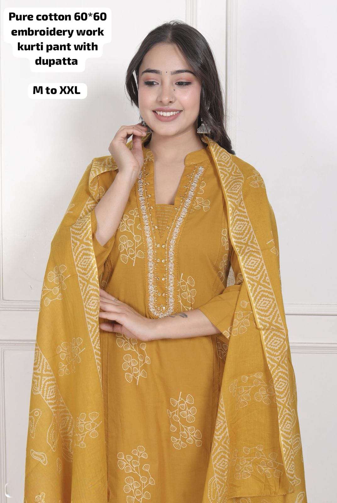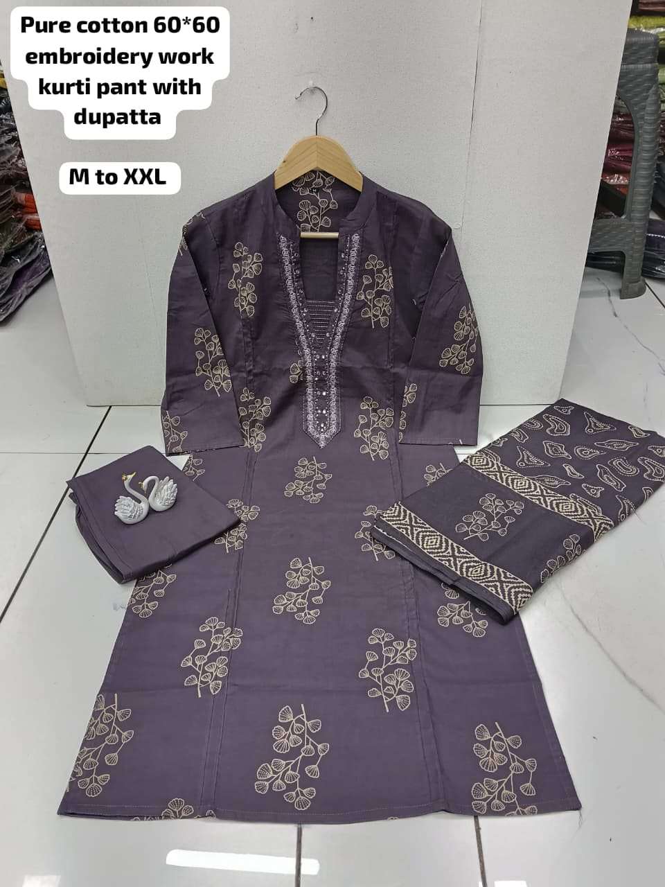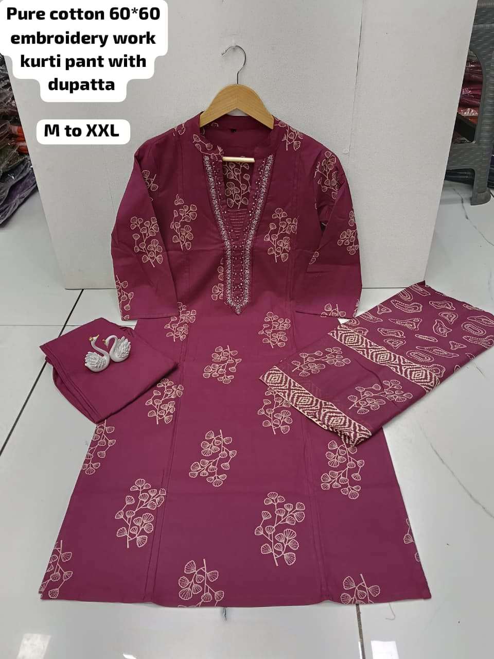 Pure cotton 60*60 embroidery work kurti pant with dupatta