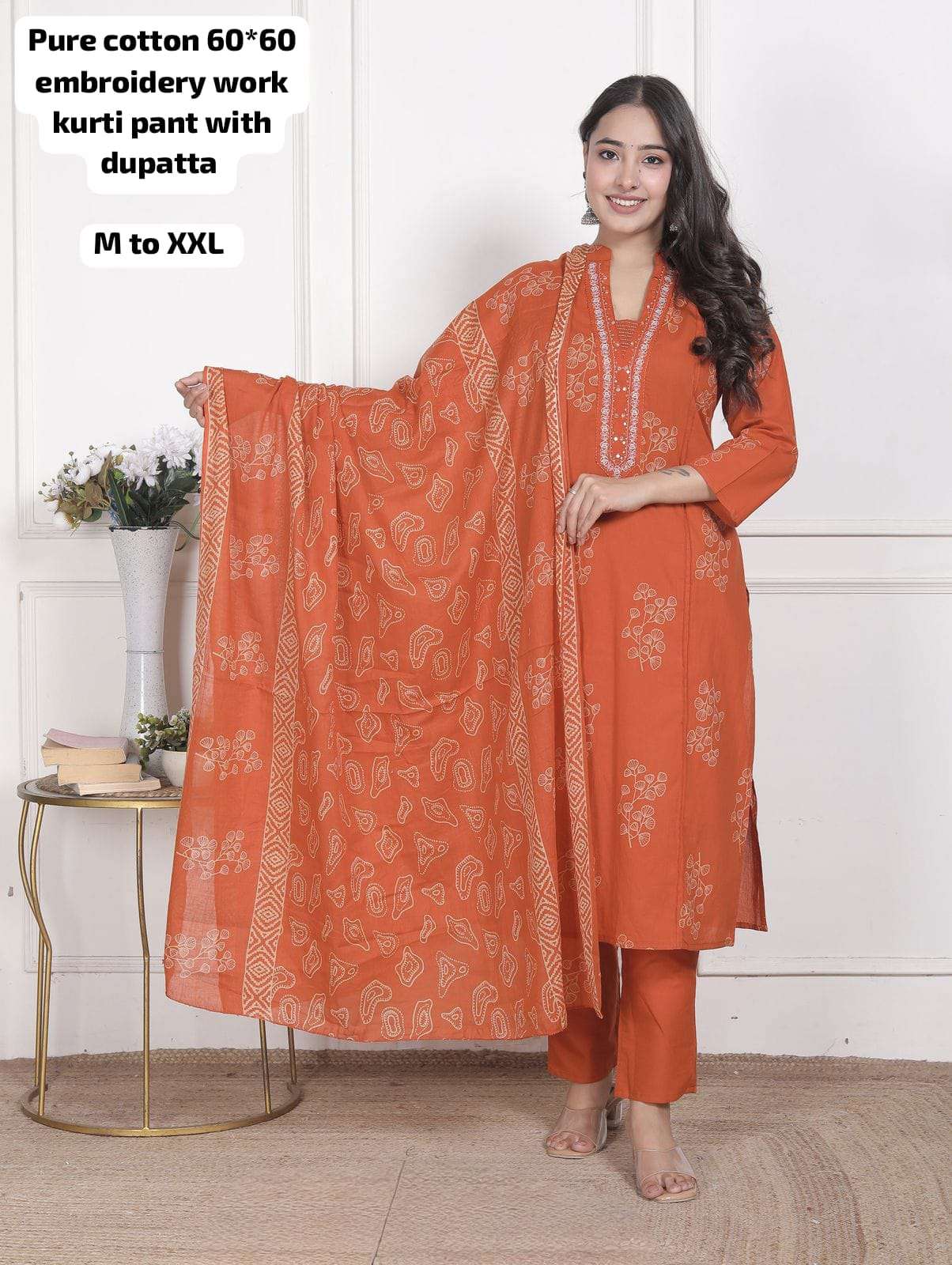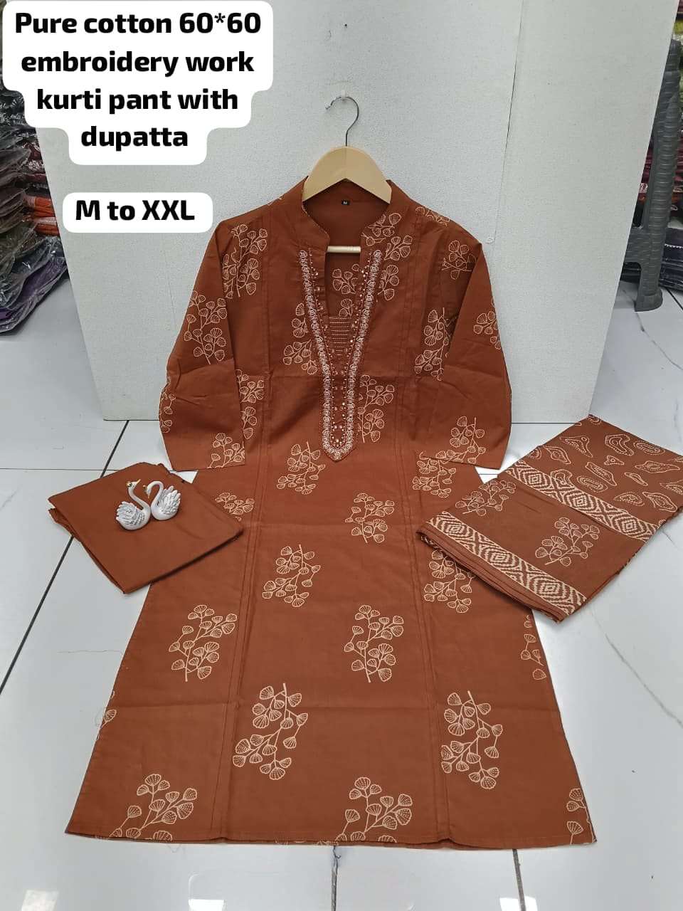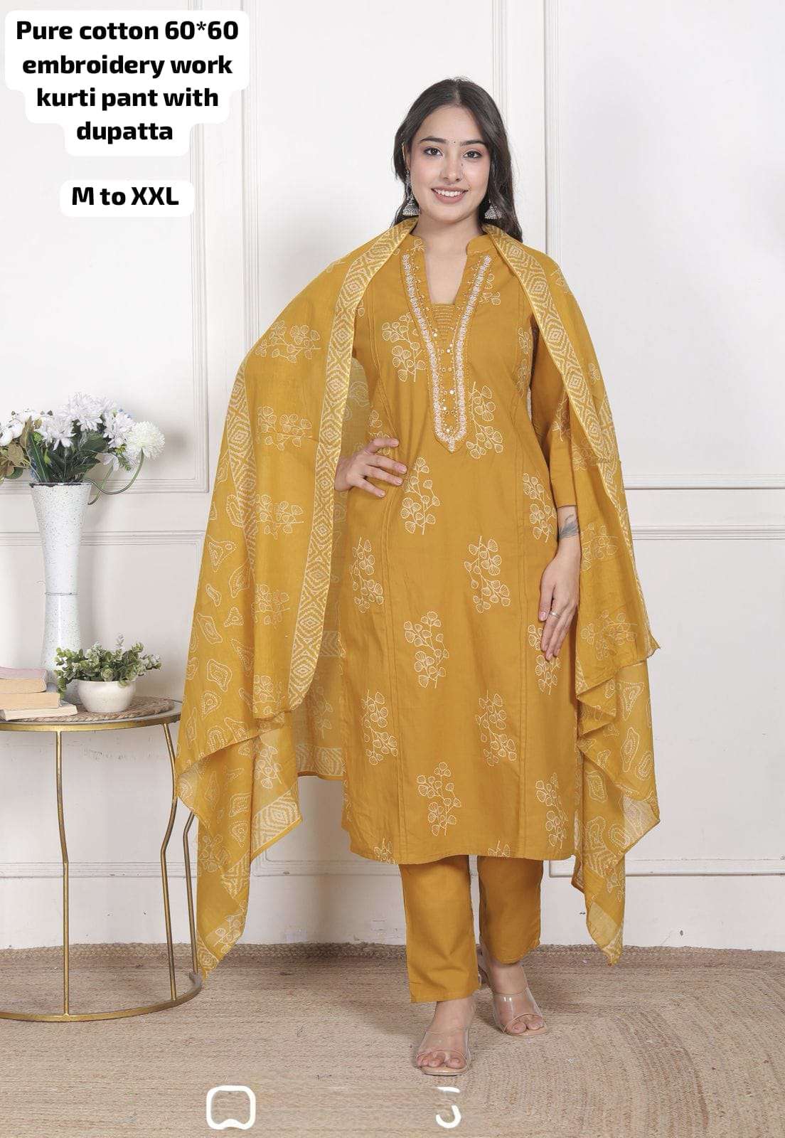 Pure cotton 60*60 embroidery work kurti pant with dupatta