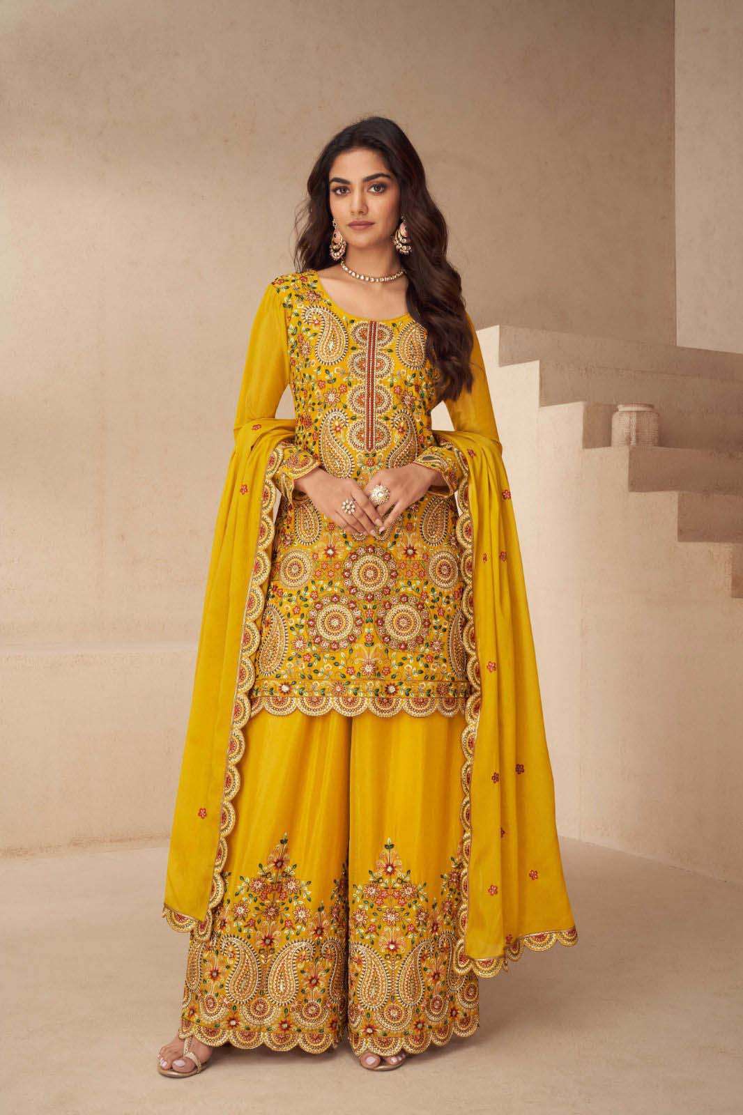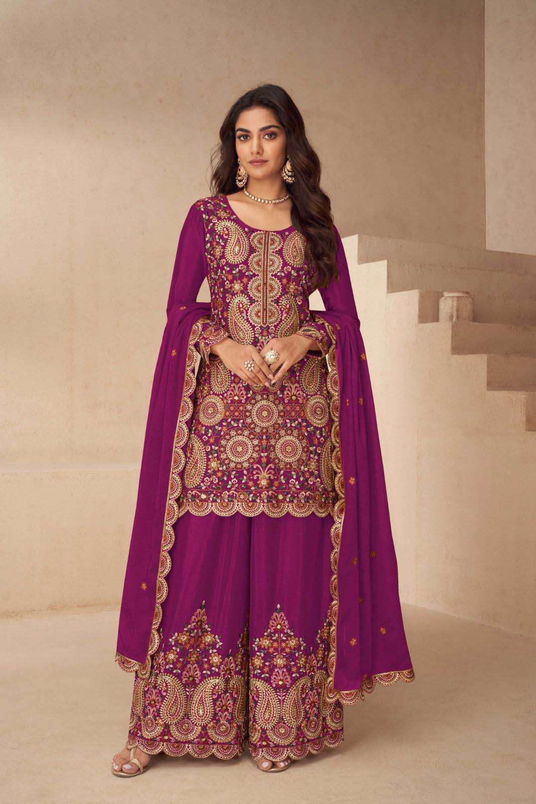Product Name - sakhi gulkayra real simar silk with heavy embroidery work on Top with palazzo and dupatta