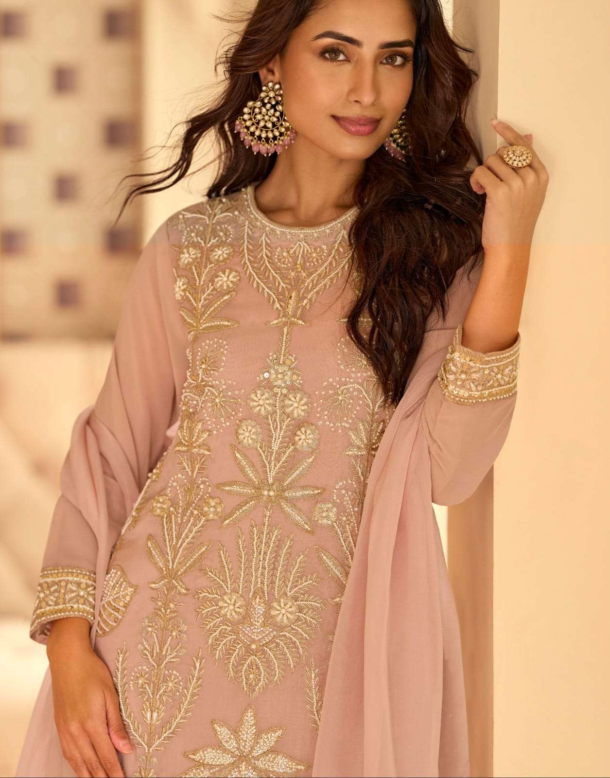 | TOP : | real premium gerogette ( heavy embroidered beads work top with plazzo pant and dupatta ) |