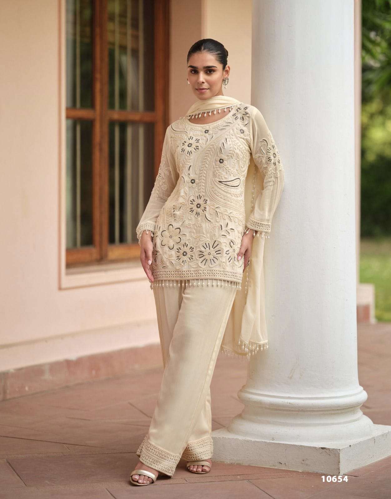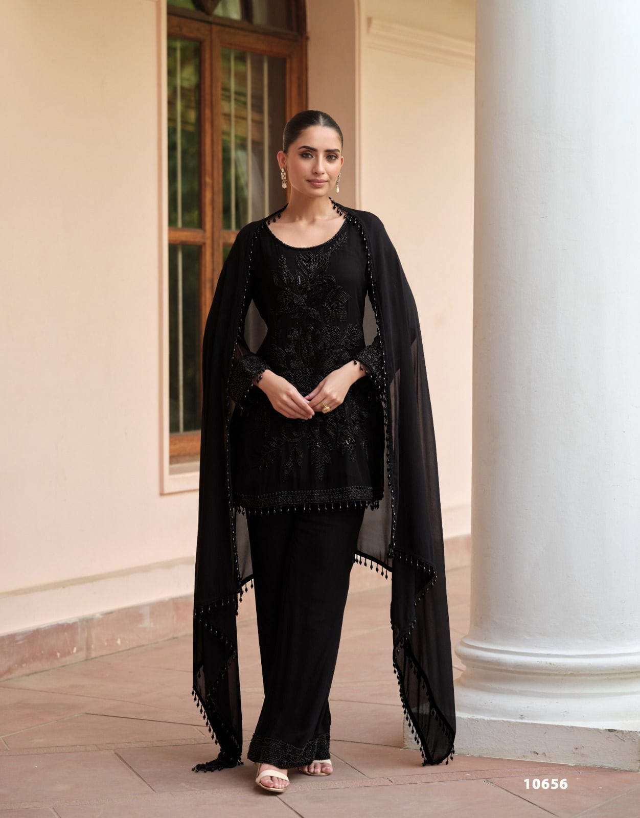 Product Name - sanvi black & white heavy chinon beads work Short Top with Palazzo and Dupatta set