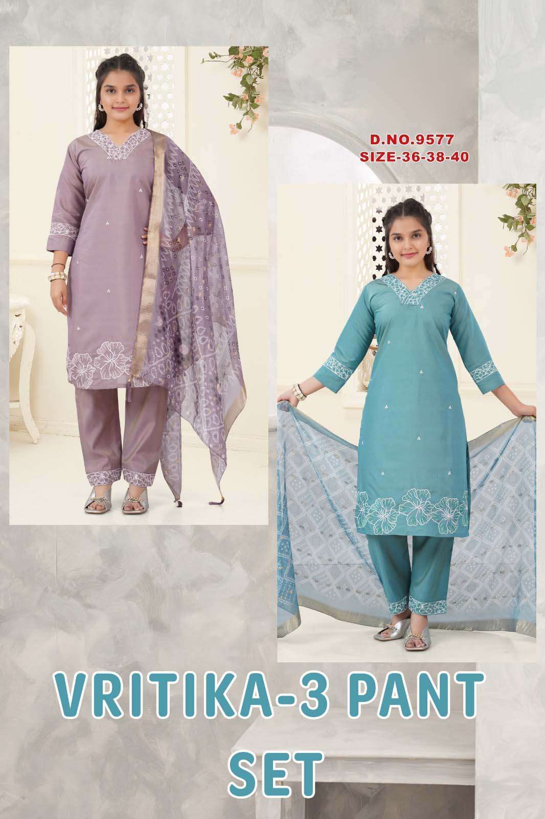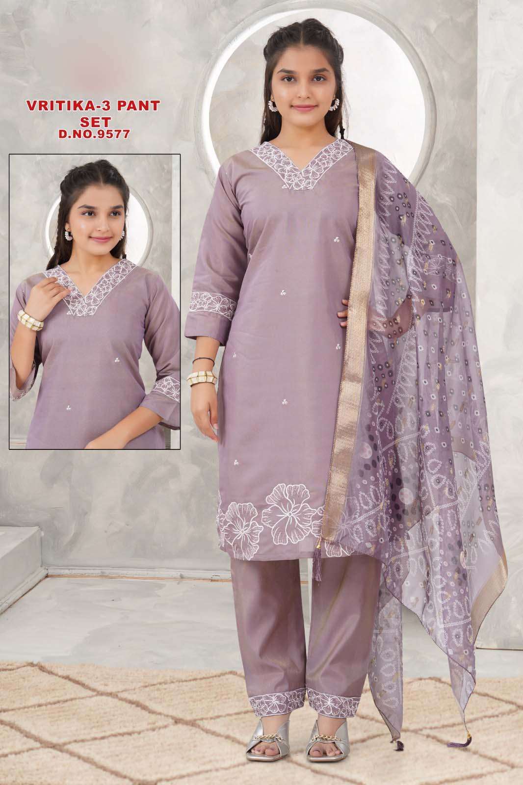 Product Name - Mitanshi Pant Set Vol 4 Kids Wear New Roman Silk Kurti Set with Digital Tabby Dupatta Krisha Creation Surat